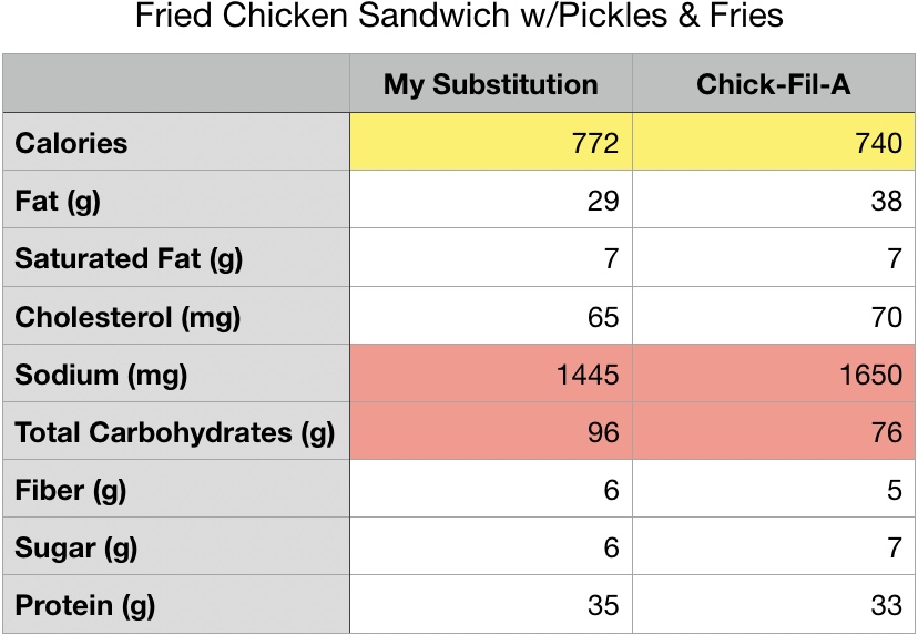 While the chicken sandwich I came up with was tasty and looks good in pictures, I have to admit that I went a little too big. The sandwich rolls I used are a quite large, and therefore really increased the sodium and carbs due to their size; this also urged me to use 3 chicken fingers instead of 2. That said, I have to highlight the Nathan’s Jumbo Crinkle Cut French Fries pictured below. These saved the meal from having an excessive sodium level and kept the overall number below what you can expect from a small meal at Chick-fil-A. Seriously, the Nathan’s fries are the real deal when it comes to a healthier fry. A serving, or 84 grams, has only 100 calories, 3 g of fat, 1 g of saturated fat, and 20 mg of sodium. A small fry at Chick-fil-A, 96 grams, has 320 calories, 19 g of fat, 3 g of saturated fat, and 240 mg of sodium. When compared to other frozen fries, the Nathan’s are still the one to beat if you’re looking for less fat and sodium. Most other frozen fries have 200-400 mg of sodium per serving!