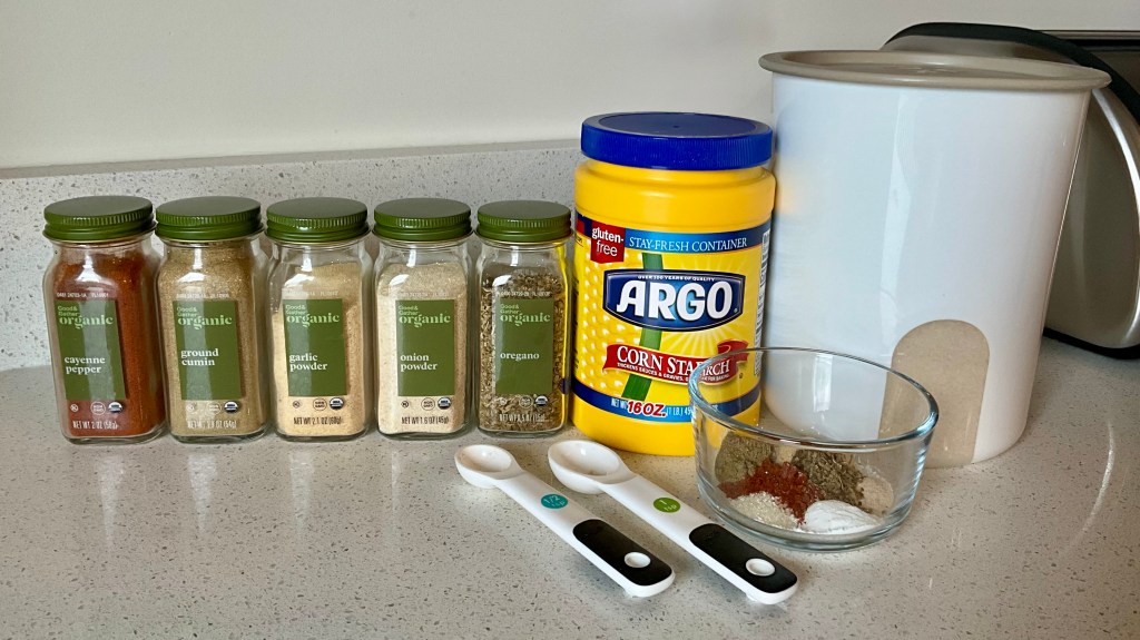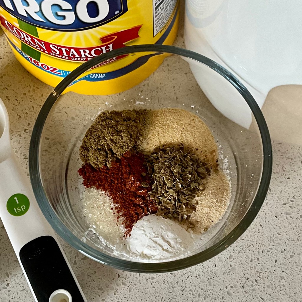 - 1/2 tsp of Cornstarch; this reduces the clumping of your seasonings, but could be skipped if you don’t have it.