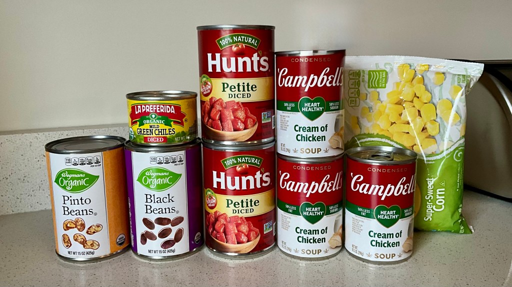 - 3 cans, or 31.5 ounces, of Campbell’s Heart Healthy Cream of Chicken Soup.