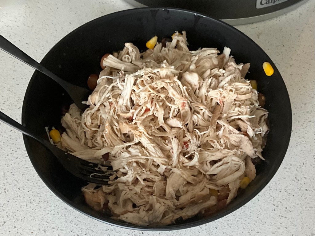 Add the pulled chicken back into the slow cooker with the other ingredients and stir everything together.
